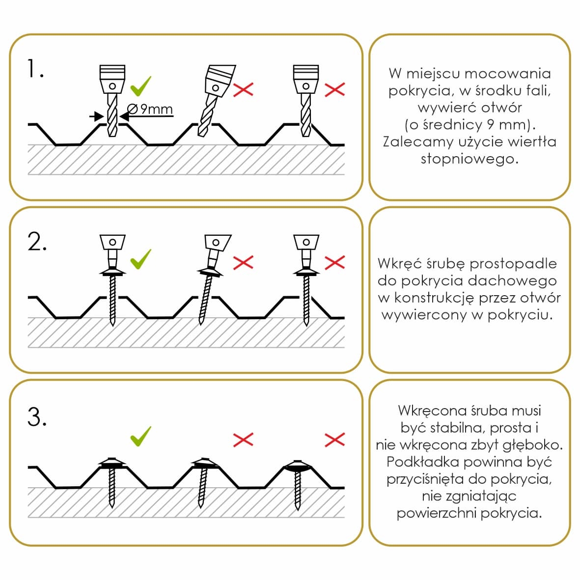 Wkręcona śruba musi być stabilna, prosta i nie może być wkręcona zbyt głęboko. Nakrętka musi być mocno dociśnięta do pokrycia, nie zgniatając jego powierzchni.