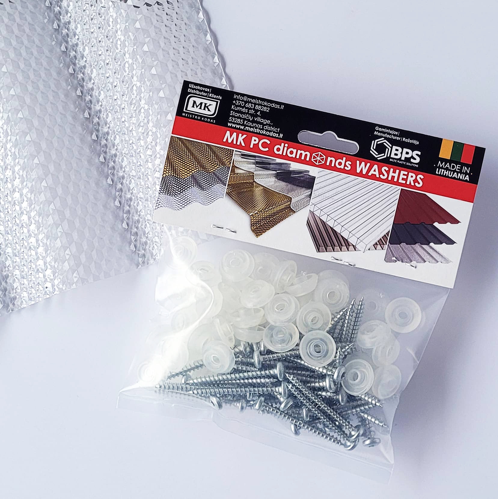 Sprzedawane w opakowaniach. Opakowanie zawiera 50 sztuk śrub z podkładkami MK PC DIAMONDS.